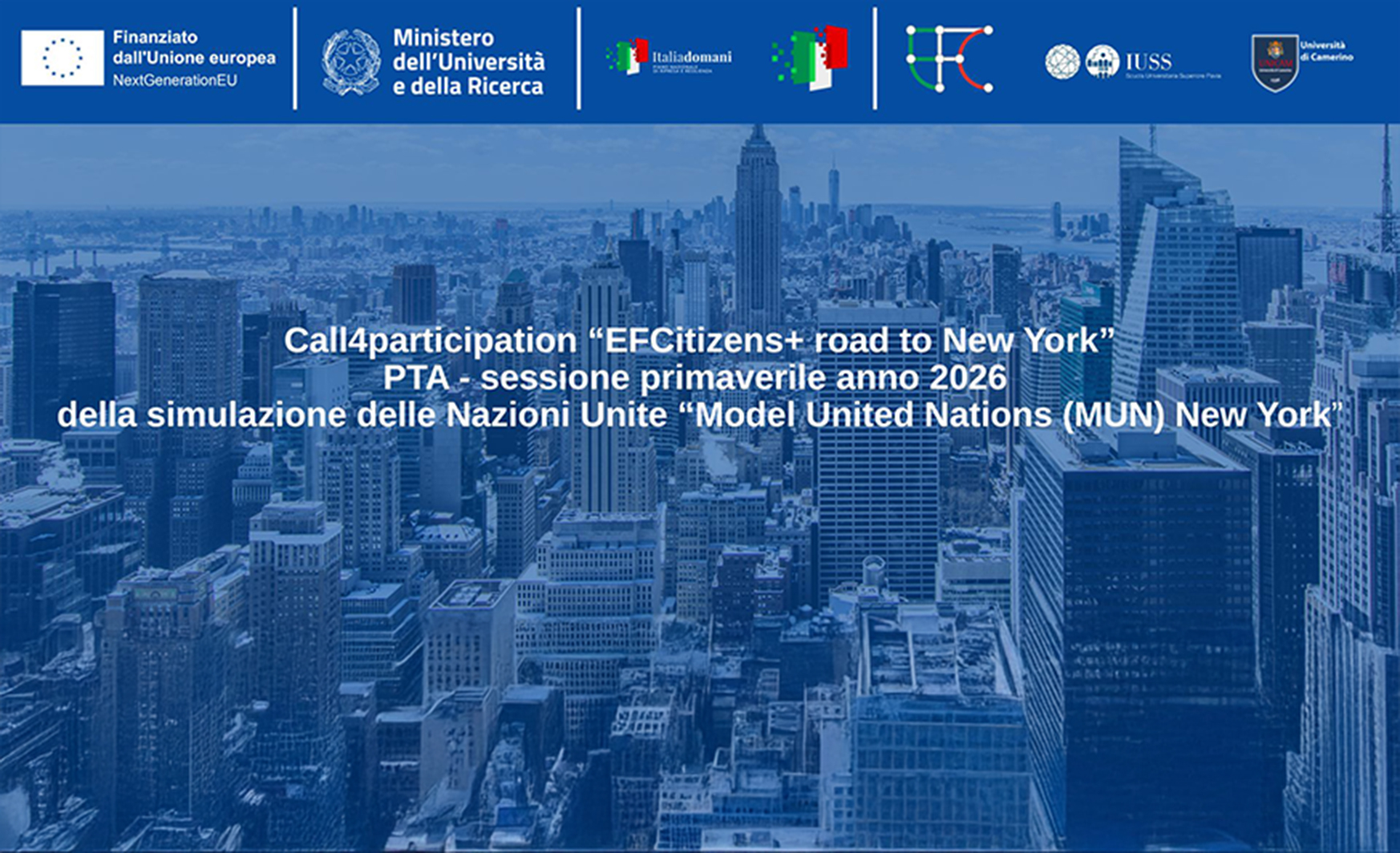 È aperta la Call4Participation “EFCitizens+ Road to New York”, rivolta al personale tecnico-amministrativo della Scuola Universitaria Superiore IUSS di Pavia e la Scuola di Studi Superiori Carlo Urbani dell’Università di Camerino, per la partecipazione alla sessione primaverile 2026 del Model United Nations (MUN) di New York.